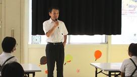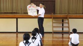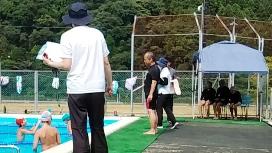 はじめに水泳記録会を行いました。当初は全校集会や学級活動の後で行う予定でしたが,児童の熱中症を防ぐため,一番涼しい時間帯に変更して行いました。児童たちは,皆よく頑張っていました。泳ぐ時以外は必ず,プールの4隅に張ってあるテントに入っていたこともあり,全員元気に記録会を終えることができました。全校集会では平和の話をしました。少し長い話になりましたが,児童たちは最後まで姿勢正しく聴いてくれました。(エアコンの効いたランチルームで行いました。)