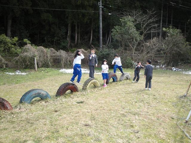 昼休みには低学年の子たちが、運動場で鬼ごっこをしたり、タイヤじゃんけんをしたりして遊んでいました。