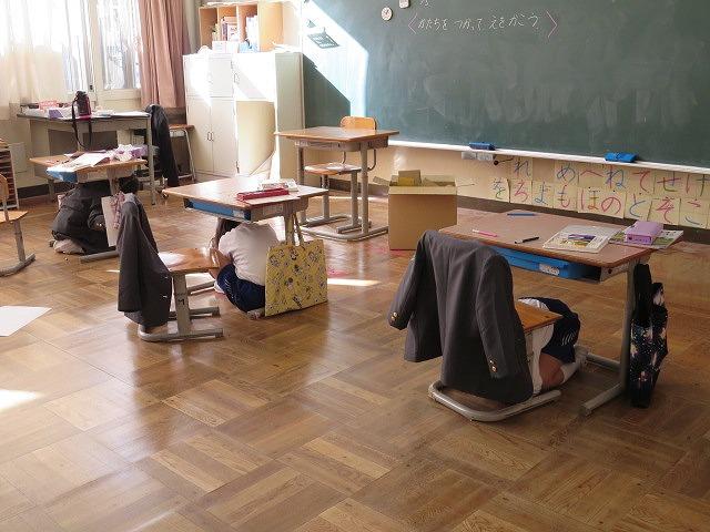 気象庁の緊急地震速報に合わせて、1年生も避難訓練をしました。