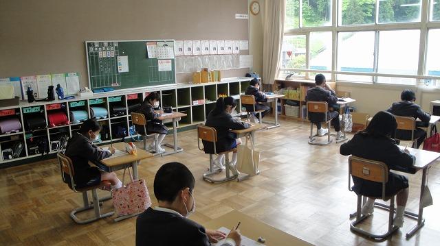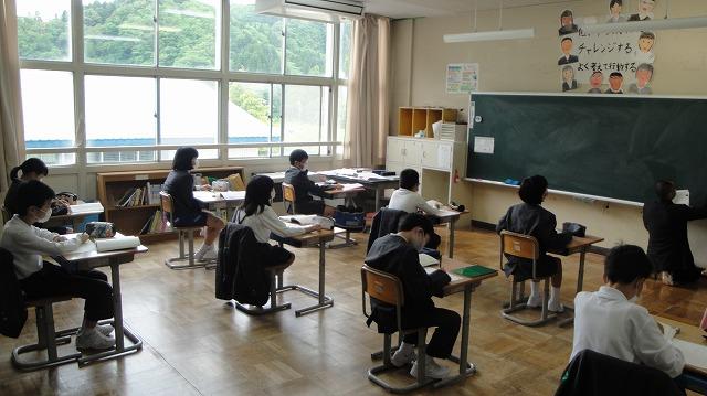 マスク着用、机の間は1m以上できるだけ広くとって、学習します。毎日、戸口や机の消毒もしています。