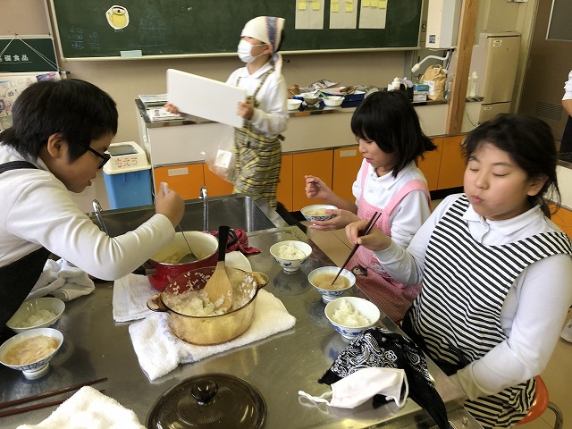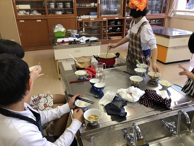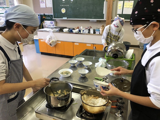 5年生が家庭科の調理実習をしました。ご飯とみそ汁作りです。