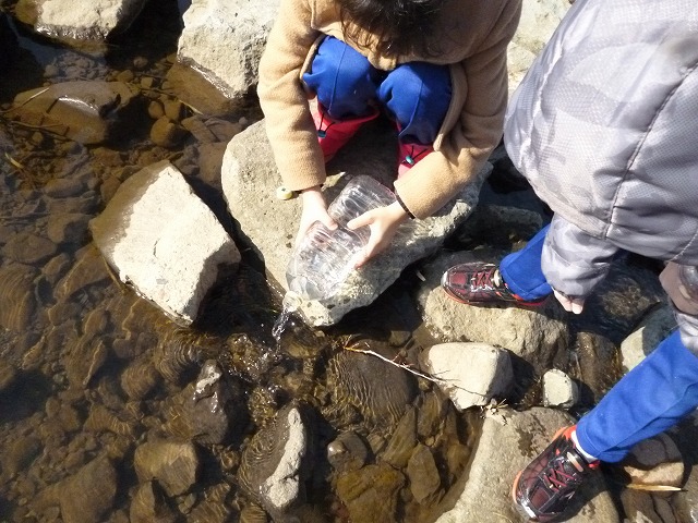 流れの緩やかな場所を探して、ペットボトルの中から出ていく小さな姿を