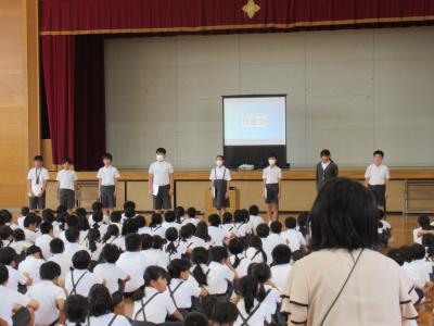 昨年度の3学期から今までずっと委員会活動ができなかった6小学校の子供たち。仮設校舎に移り、自分たちの学校ができたため、ようやく児童会が動き出しました。各委員長は、ひとりひとり校長先生から任命証を受け取り、抱負を述べました。また、各学級の学級代表も名前を呼ばれ、ステキな返事を聞かせてくれました。6小学校全員の心を一つにして、よりよい学校を創り上げていこうという気持ちが高まった児童会になりました。