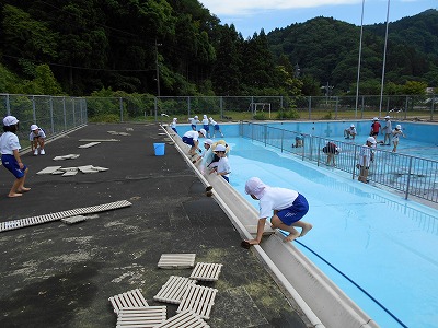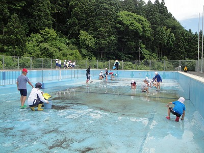 今日はプール掃除をしました。プールの底や壁を磨いたり、プール周囲の溝のゴミをとったりしました。
