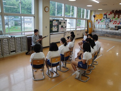 低学年には「おんちょろちょろ」「おおきくなったらなにになる?」、中学年には「おもいついたらそのときに」、高学年には「世界一の石の塔」を読んでいただきました。