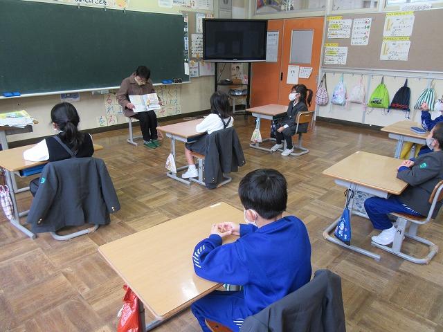 中学年は、大雪の日に渋滞している道筋で、地域のみんなが協力して援助しているお話でした。