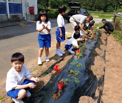 藤井さん(穴水町)のご指導で、2年生がミニトマトの苗植えをしました。