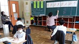 1・2年生は書写。1年生は「ひらがなのかきかた」,2年生は「点や画の組み立て」。1時間の中で先生がいてくれるのは半分の時間。しかし,両学年とも,先生がいない時間帯も,しっかり学習していました。
