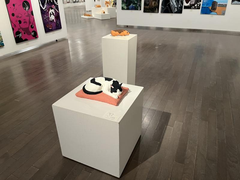立体作品を制作した2年中川妃菜さんの『にゃんこ』は優良賞、2年沖野 萌さんの『将来について考える』は佳作に入賞しました。