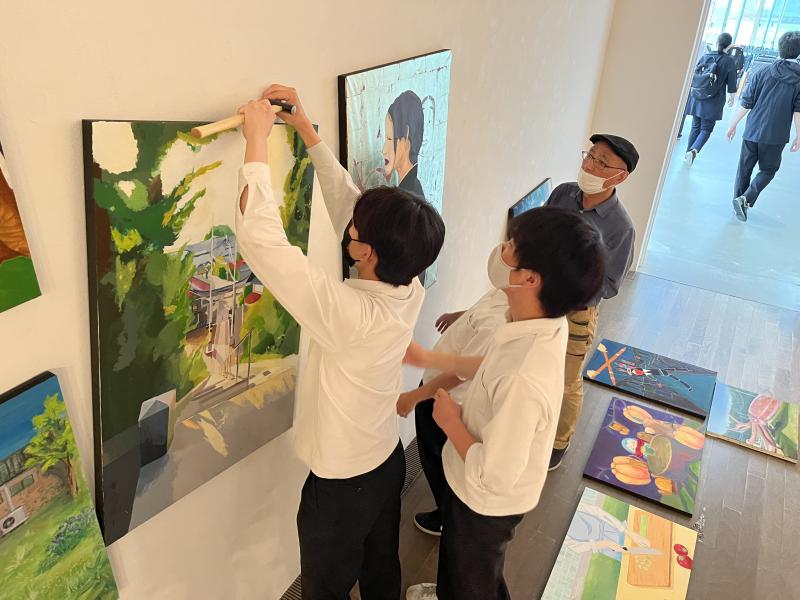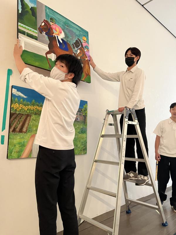 この3年間、コロナのため生徒が展示作業するのに制限があり、なかなか展示作業をする機会がなかったのですが、3年生の男子3人が協力し合い一生懸命展示をしていた姿はとてもキラキラしていました。