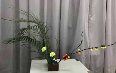 傾真型に挑戦しました。真の枝は45度、控えは75度、副えは15度を念頭に置きながら生けました。