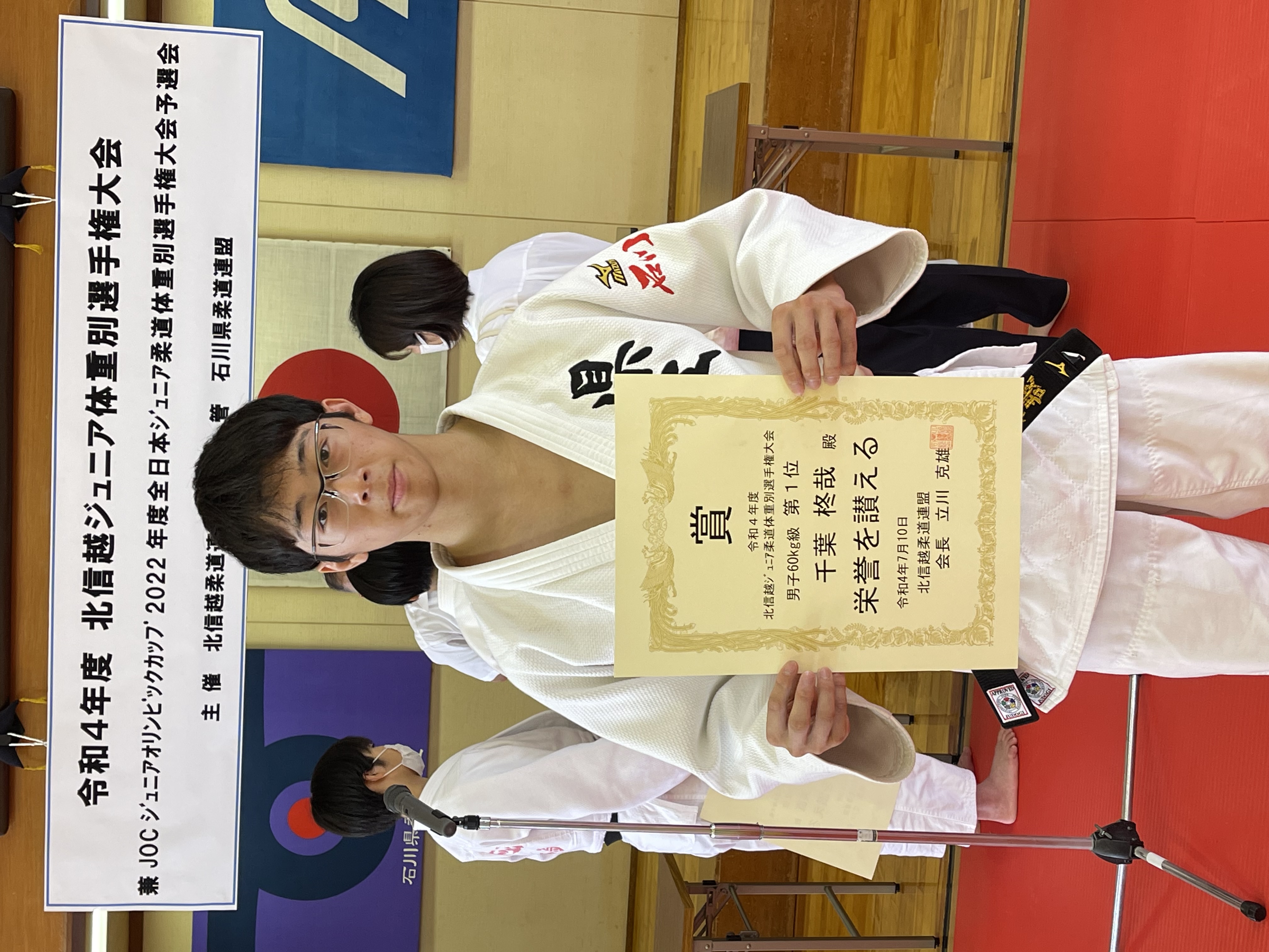本校から5月の石川県大会、男子個人60kg級で優勝した 千葉 柊哉(3年・機械システム科)選手が石川県代表として出場しました。北信越5県の代表で争われた試合で優勝し9月10日(土)、11日(日)に埼玉県立武道館にて行われる、全日本ジュニア柔道体重別選手権大会に出場することが決まりました。