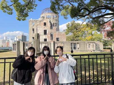 行くまでにサンダーバードと新幹線で約半日かかり行くだけでかなり疲れた。広島に着いてからは路面電車に乗り原爆ドームへ向かった。原爆ドームを生で見たのは初めてでとても迫力があった。昼食は広島県といえばお好み焼きと言うことでお好み焼きを食べた。後にバスガイドさんからお好み焼きの歴史を聞きいろいろ学ぶことができた。