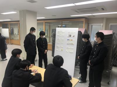 令和5年2月20日(月)工業技術探究の授業で、半年間かけて探究してきた内容をポスターセッションで発表をしました。生徒40人が3~4人の12班に分かれ、各班の探究してきた内容をポスターにまとめ、相互に発表し合いました。通常の発表と比べ、質問や意見交換がより活発になり、有意義な時間を過ごすことができました。