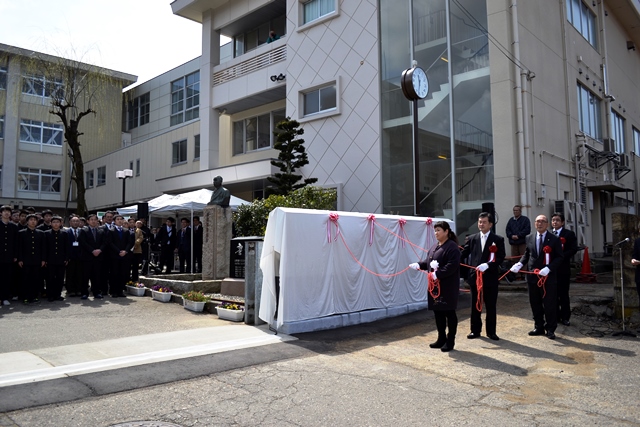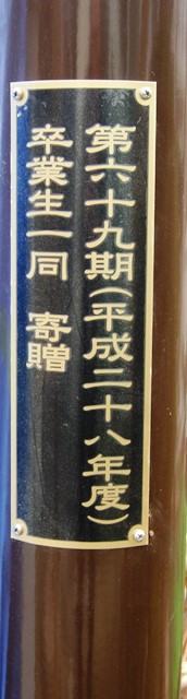 校舎に向かって時計右側下部には、「第六十九期(平成二十八年度)卒業生一同 寄贈」と記してあります。