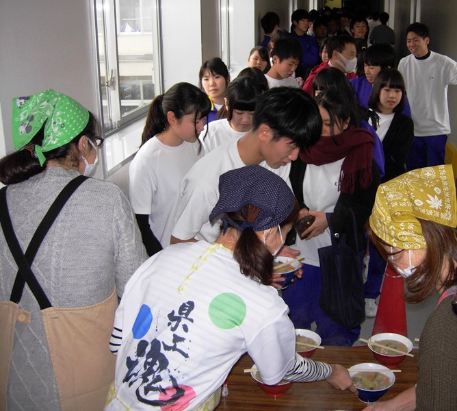 2日目の12/20には、PTA山田会長、母親代表委員の計36名のご協力により、めった汁が振る舞われました。「お母さん、ありがとう!」