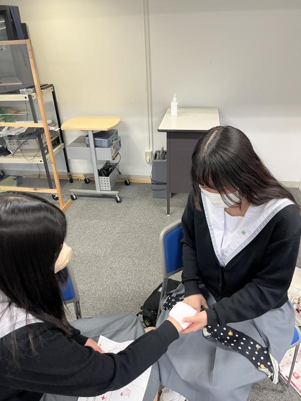 練習の成果が出た人も、少し練習不足だった人もいましたが、緊張感のある中、頑張りました。今回習った三角巾の手当の方法で、何かあったときは自ら動けるようにしたいです。