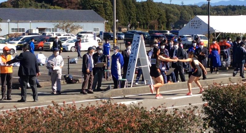 【2区4㎞も競歩の池田夢花18分58秒で区間12位でした。平下から池田へのタスキリレーです。池田さん足の調子が悪く力を発揮できませんでしたが何とか襷を繋ぎました。】