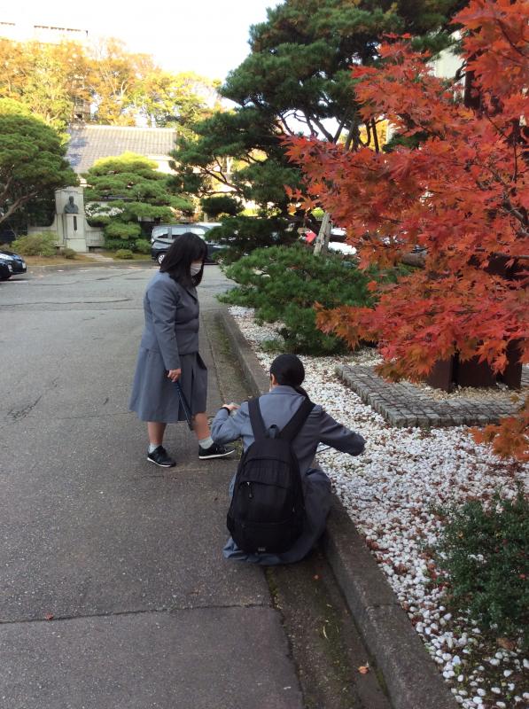 新型コロナウイルス感染症の影響で、例年のような活動ができない中「何かできないか。」と考えた結果、生徒玄関前の落ち葉を掃除しました。登下校時に私たちの目を楽しませてくれた黄色や赤の鮮やかな紅葉は、日々掃除しても地面を埋め尽くすほどでした。そこで、JRCメンバーで玄関前の落ち葉掃除をしました。わずかな時間でしたが、あっという間にゴミ袋がいっぱいになりました。