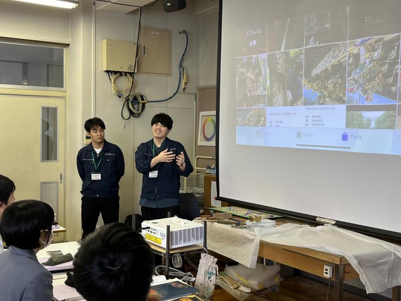 小西美術社は国宝・重要文化財などの建造物や美術工芸品の保存修理を主に手掛け、漆塗・彩色・錺金具等の総合的な装飾技術を保持する唯一の会社です。小西美術工芸社に就職されたお二人は、業界最大手の老舗企業の漆芸部門の修復職人として、全国の神社・仏閣の修復・復元に携わっておられます。日光東照宮本殿の修復現場での仕事内容や実際に使っていらっしゃる道具を見せていただきながら、仕事のやりがいや就職してからの技術の鍛錬について話していただいた。興味を持って話を聞き、質問をする生徒の姿が見られました。実際に工芸の分野で働いていらっしゃる先輩方の話を聞ける貴重な時間となりました。