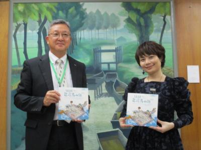 台湾の台南市文化資産管理処の対日窓口で通訳の池田リリイ茜藍氏が本校を訪れ、本校校長室にて、「1930・烏山頭~水がめぐる平野の物語~」の贈呈式が行われました。