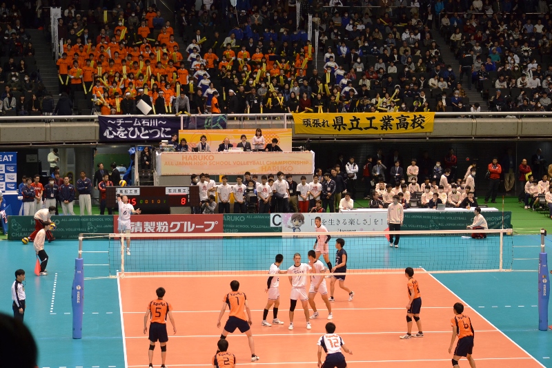 男子バレーボール部は、このほど1月4日に開幕した第69回全日本バレーボール高等学校選手権大会(ジャパネット杯 春の高校バレー)に出場しました。1回戦の相手は、何と姉妹校である香川県立高松工芸高校でした。結果は惜しくも 0対2 で敗れましたが、教職員・生徒の約100名の大応援団と、同窓会関東支部の皆さんの声援を受け、力一杯プレーしました。