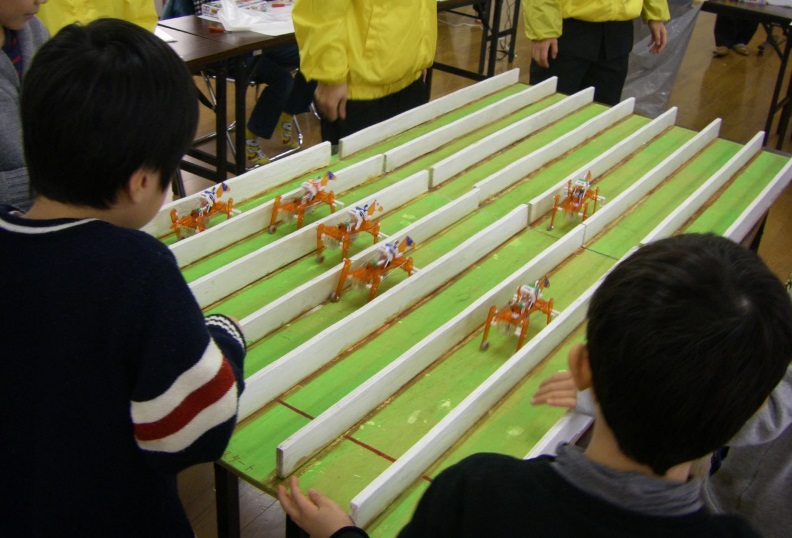 科学工学同好会6名、金沢市材木公民館で出前ものづくり教室を行いました。兼六小学校17名の児童が参加し、楽しいものづくり教室となりました。ロボットホース(馬)を作ったあと、みんなで競争しました。