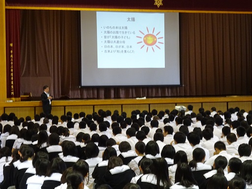 日本人の若者は、自分に価値を見い出せないなどの国際調査の結果があるが、「太陽」「自然」「父母」の「三恩」を大切にしてきた歴史や、我々皆が「太陽の子ども」であるという考え方を踏まえ、自分自身や周囲の仲間を大切にし、自信を持って生きてほしいと締めくくりました。