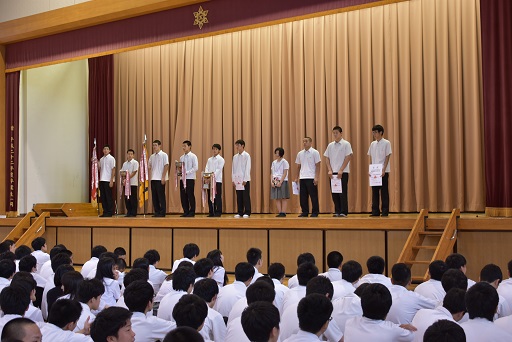 生徒会主催の表彰報告会(石川県高等学校総合体育大会、総合文化祭、その他大会の表彰)を行いました。