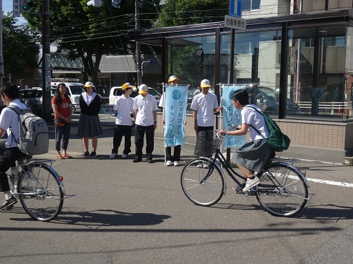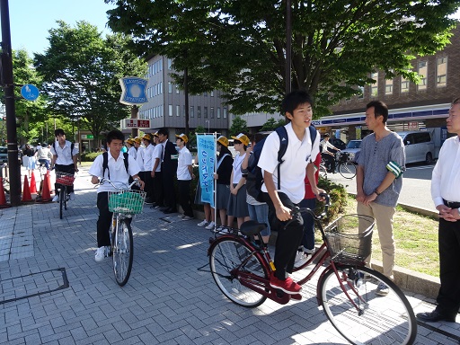 6月22日(金)7時50分から30分間、通学時における自転車乗車マナー一斉指導を行いました。本校厚生委員や生徒会執行部など生徒33名、教員12名、PTA12名で鱗町交差点、本多町交差点、金沢中警察署横交差点、本校校門前の4カ所に分かれて指導を行いました。