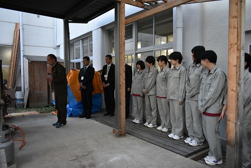 7日午前9時、火入れにさいし本校教諭が祝詞をあげ、1人ひとりが思いを込めて薪をくべ、火入れをしました。明日8日の午前10時半頃まで温度(約1300℃まで)を上げて焼き上げます。