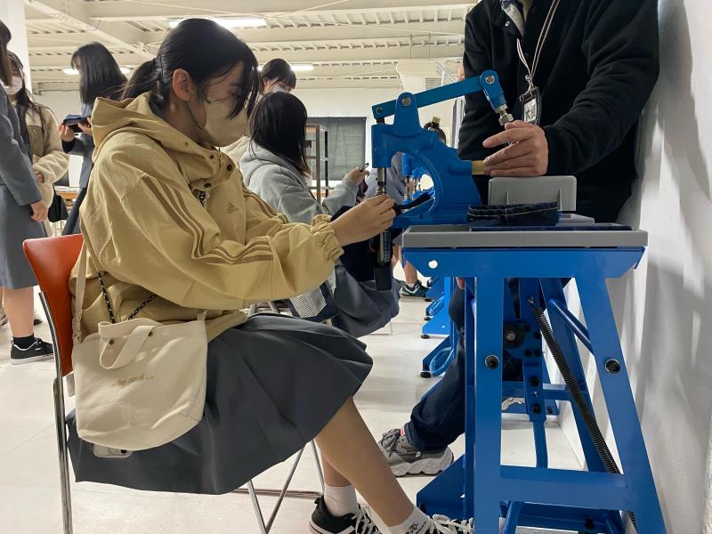 体験で自分だけのデニムのポーチを作ってきました。写真はその様子です。