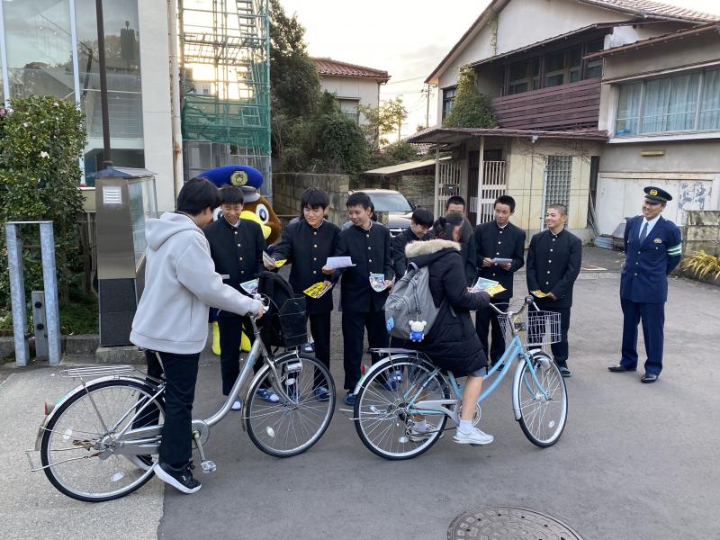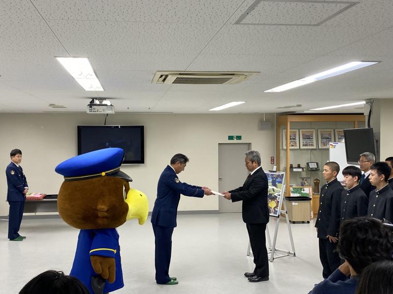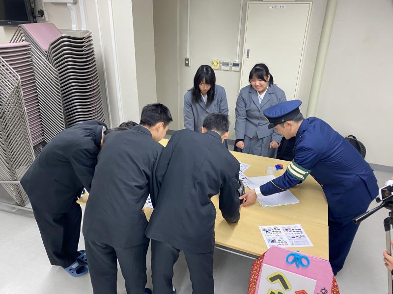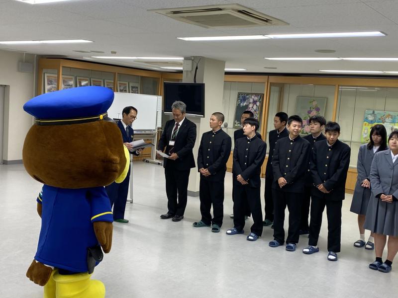 令和5年4月に自転車乗車用ヘルメットの着用が努力義務化されましたが、未だ着用が浸透しているとは言えない状況にあります。そこで、自転車ヘルメットを生徒に交付して自転車ヘルメットの着用を促す目的で金沢中警察署の方々から生徒たちにヘルメットを贈呈して頂きました。
