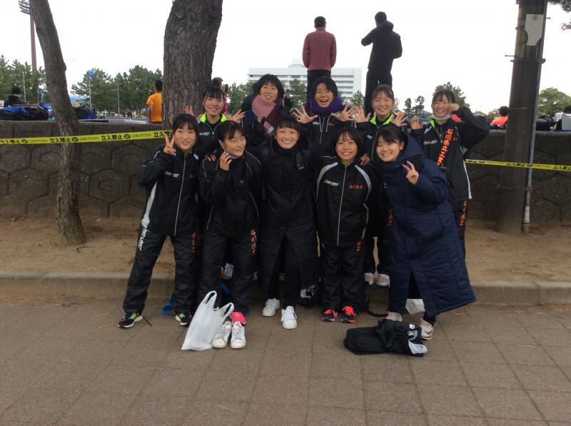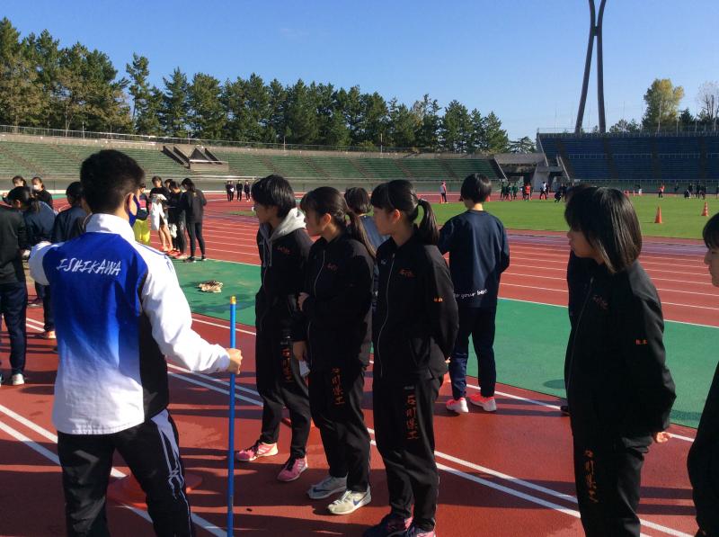 11月1日(日) 小松末広陸上競技場で石川県駅伝選手権が行われました。全国高校駅伝の予選を兼ねた高校は男子で遊学館が12連覇 女子が星稜が2年連続11度目の優勝を果たし都大路の切符をつかみました。従来のこまつドーム発着・中継点コースに熊が出没する恐れがあるため、安全に万全を期し、たすき渡し無しの新型コロナウイルス感染防止の無観客で行われました。本校女子も力走1区辻 優良(2年) 2区太田喜梨(2年) 3区笹山葵衣(2年)  4区岩本小華(1年)5区池田夢花(1年) オーダーで臨み1時間37分35秒で11位 2009年に本校女子が記録した1時間31分18秒には及びませんでしたが選手達は応援も含め心のたすきを繋ぐ事ができました。無事に完走することができて本当に良かったと思います。ご声援ありがとうございました。