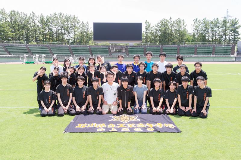 令和2年度陸上競技部集合写真です。今年はコロナ禍でほとんどの試合が中止になり3年生にとっては非常に残念な結果となりました。写真は3年生が引退した後、7月11日(土)~12日(日)に行われた第1回金沢地区記録会の競技終了後11日(土)に撮影しました。撮影後のお別れの挨拶で竹本君 原さんからお話があり、また3年生全員から後輩に向けての激励がありました。その言葉を聞いている後輩達はとても悲しそうでした。
