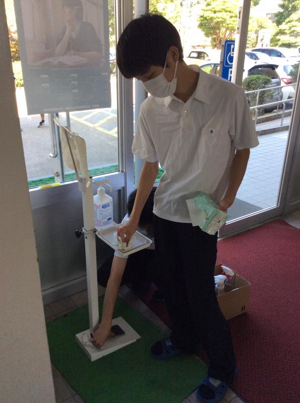 新型コロナウイルスの影響で、なかなか校外での活動はできませんが、ボランティア活動の報告をします。基本的には、学校内の石けんや消毒の補充を行ったり、清掃活動を行ったりしています。
