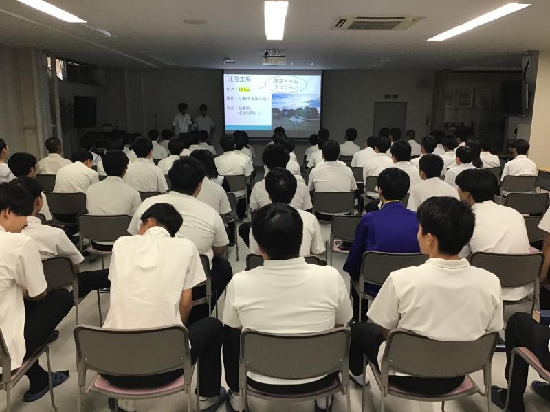 7月の後半、8月の後半に加賀製紙株式会社さん、石川メッキ工業(株)さん、信晃化学株式会社さん、DIC(株)北陸工場さんにお願いして、2年生を対象にインターンシップを行い、9月11日(水)、インターンシップに行ってきた生徒に材料化学科1、2年生に報告してもらいました。県工生の大半は卒業後に就職する生徒が多いため、将来について考える有意義な時間となりました。