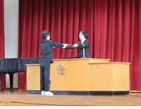 次に5年生が「風とケーナのロマンス」のリコーダー演奏、「Michel Row the Boat Ashore」の歌を披露しました。