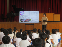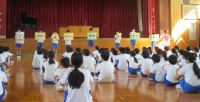 また、保健給食委員会からは 今月の生活目標「ケガをせずに安全にすごそう」についての呼びかけがありました。本校で多いケガやケガしやすい場所、ケガの予防についてのお話、からだを動かす前にするとよいストレッチも紹介されました。
