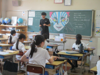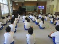 ビキニ諸島で行われたアメリカの核実験による周辺の海の生き物たちの被爆の物語です。トビウオのお母さんの祈りも届かず坊やは亡くなってしまい... 悲しいお話をでしたが、そのあと「あなた達一人ひとりが平和について考え、自分たちで平和をつくっていってほしい」との呼びかけに、多くの子が真剣な顔で頷いていました。