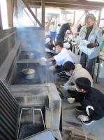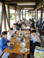 【野外炊さん(カレー作り)】 竈でご飯を焚き、カレーを作りました。薪で火を起こすのに苦労しましたが、なんとか全グループ完成させることができ、ホッとしました。一から手づくりのカレーライスはとってもおいしかったです! どのグループも完食しました。