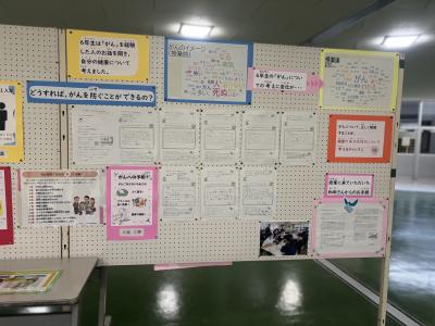 先月6年生で行った「がん教育」。その後の活動として、1階中央ホールに「がん」についての掲示や、授業で使用したワークシート(一部)、児童が作成したポスターを掲示しています。