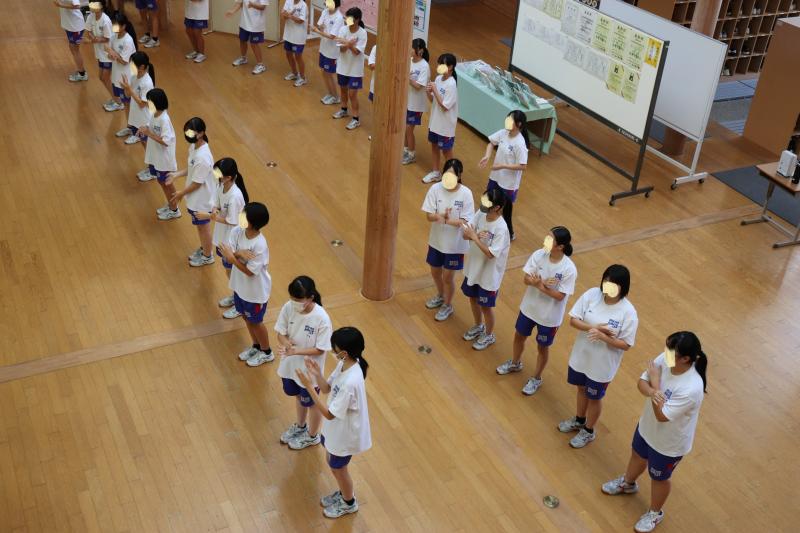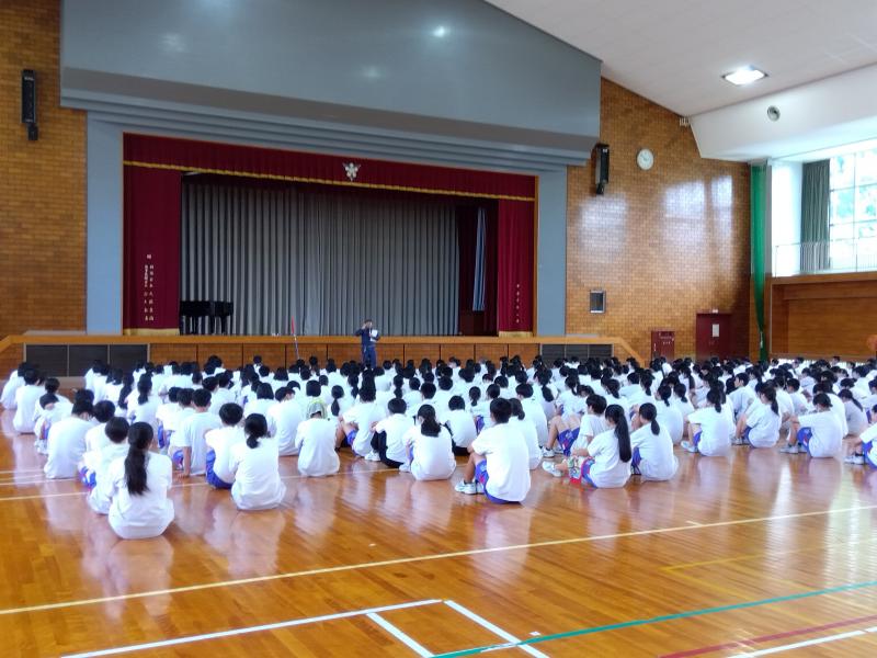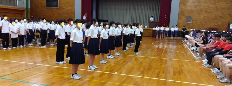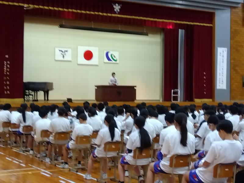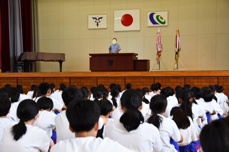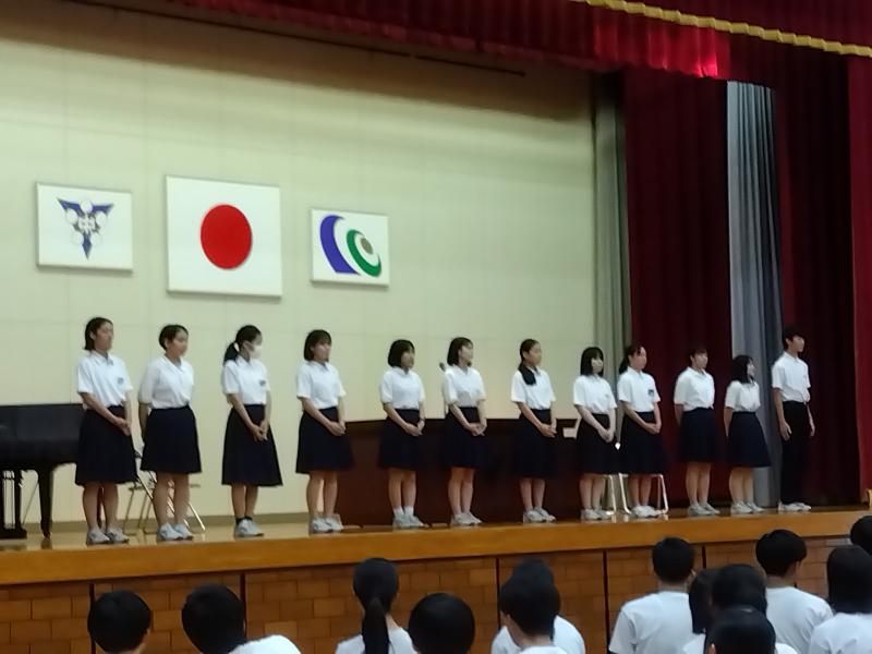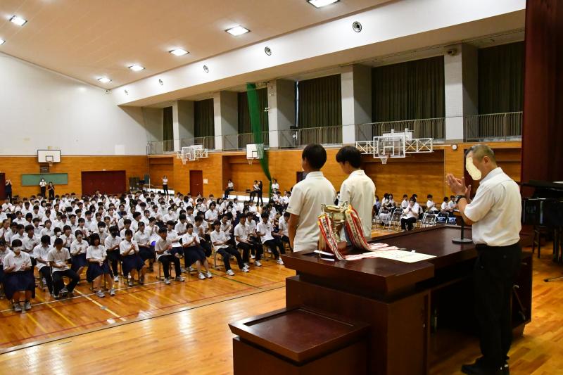 全国大会に出場した男子テニス・女子バスケ・陸上(個人)からの結果報告、夏休みにあった大会やコンクール等の表彰披露、また学び集会を行い、1学期の取り組みの結果と2学期からの学習についてのお話がありました。