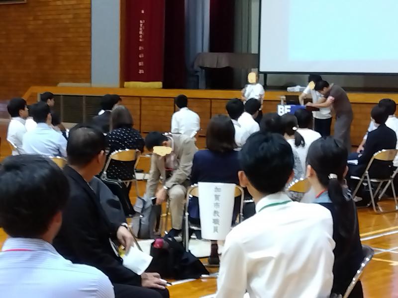 本日のテスト後の4限目に大聖寺高校から了舟先生に来てもらい、夢授業についての話を全校生徒で聞きました。