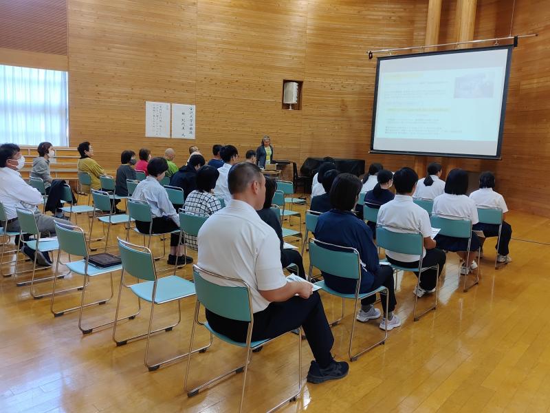 また、午後からは「実践的な訓練、困りごとが少ない備え・マニュアルを協働で整えるために」という演題で林准教授からの講演を聴きました。地域の防災士の方、生徒会のメンバー、教職員が参加しました。