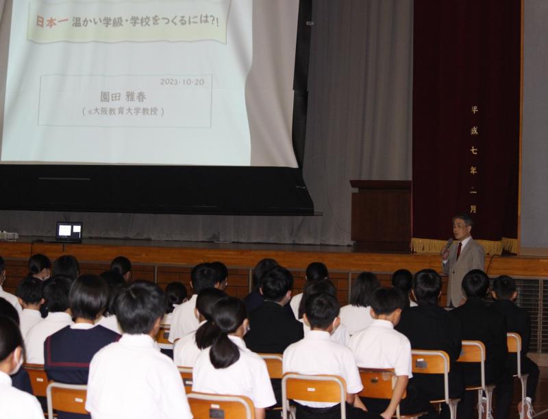 講師として園田雅春先生に来ていただき、「日本一温かい学級・学校をつくるには?!」という題目で講演を聞きました。