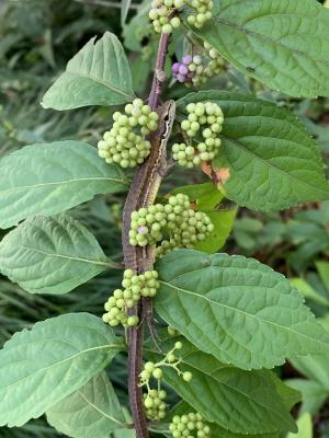 ムラサキシキブの枝に上手く?隠れているつもりの「カナヘビ」ぱっと見わかりませんでした。何々と目を凝らしてみてやっとわかりました。