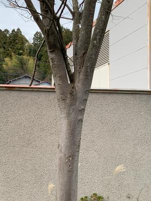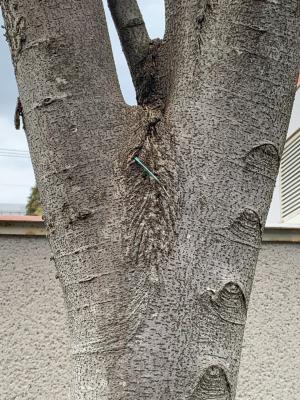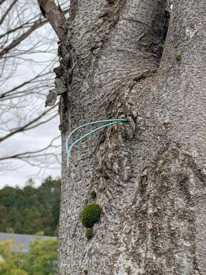12年前に設置したエサ台の針金が、ケヤキの成長とともに木の一部となって残っていました。