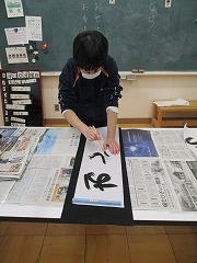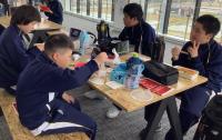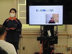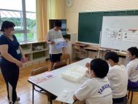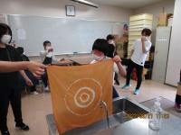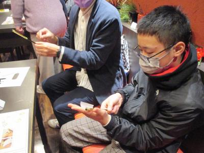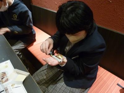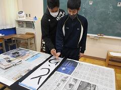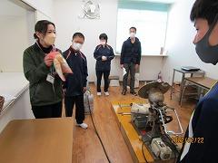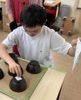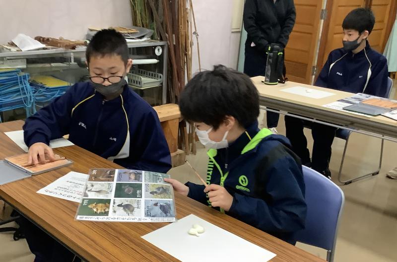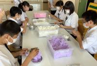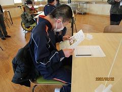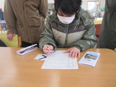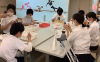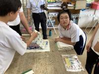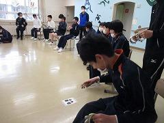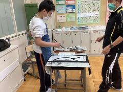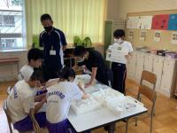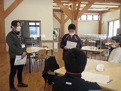 本校生徒が説明から見本までを示し、その後に橋立中学校の生徒が、本校生徒に聞きながら作業を