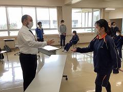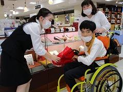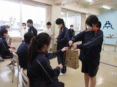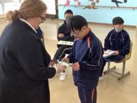 学校に無事到着し、解散式では、今回の修学旅行でお世話になった旅行会社の添乗員さん、バスの運転手さん、バスガイドさんにお礼の言葉と作業製品のプレゼントを渡しました。